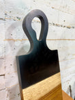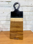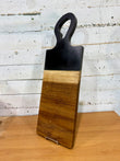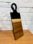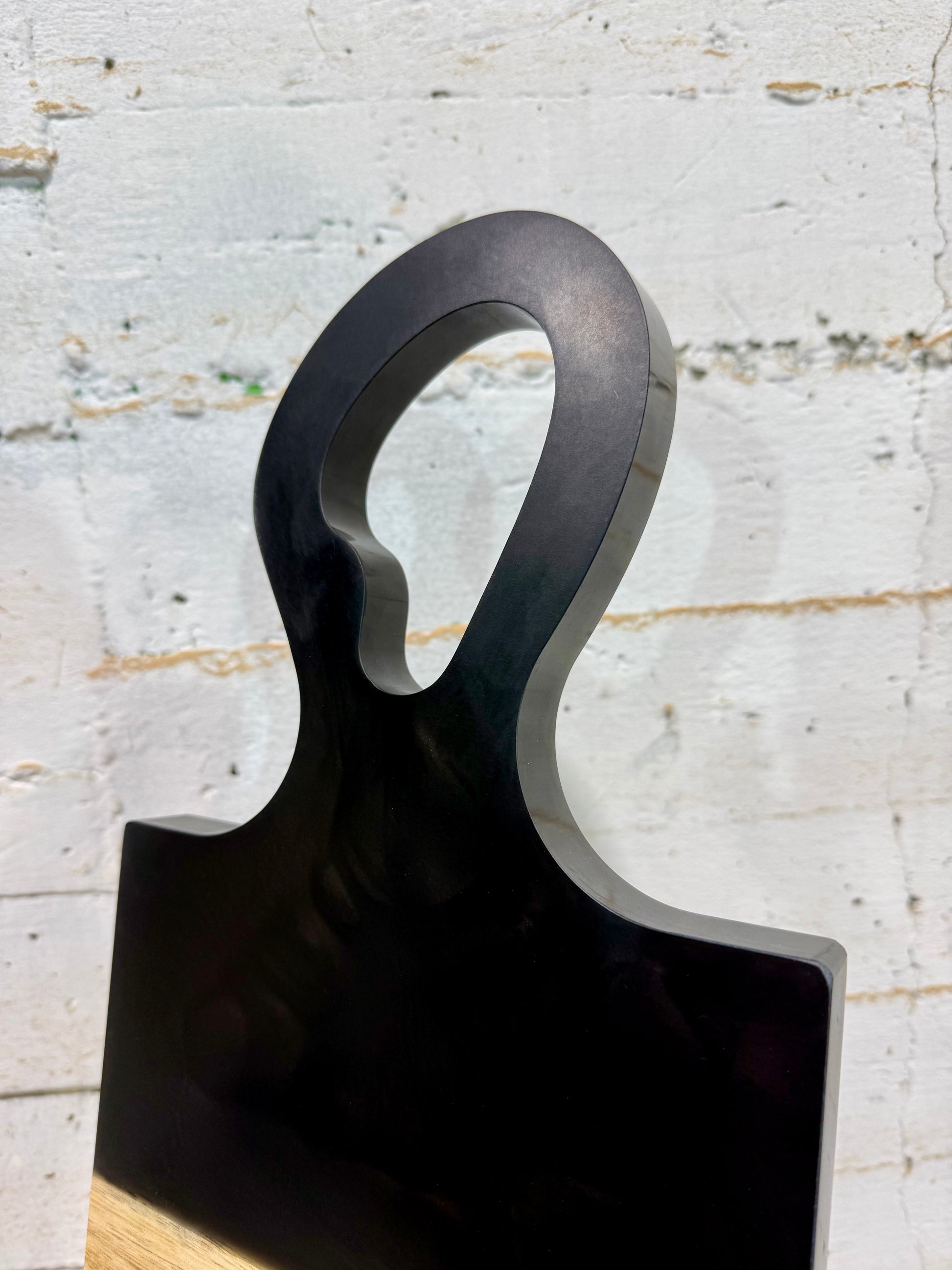 Tagliere artigianale di grandi dimensioni, realizzato a mano combinando legno di iroko con resina epossidica nera metallizzata. La forma moderna con manico sagomato lo rende perfetto per servire aperitivi, sushi, antipasti e degustazioni con forte impatto visivo.