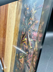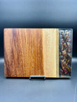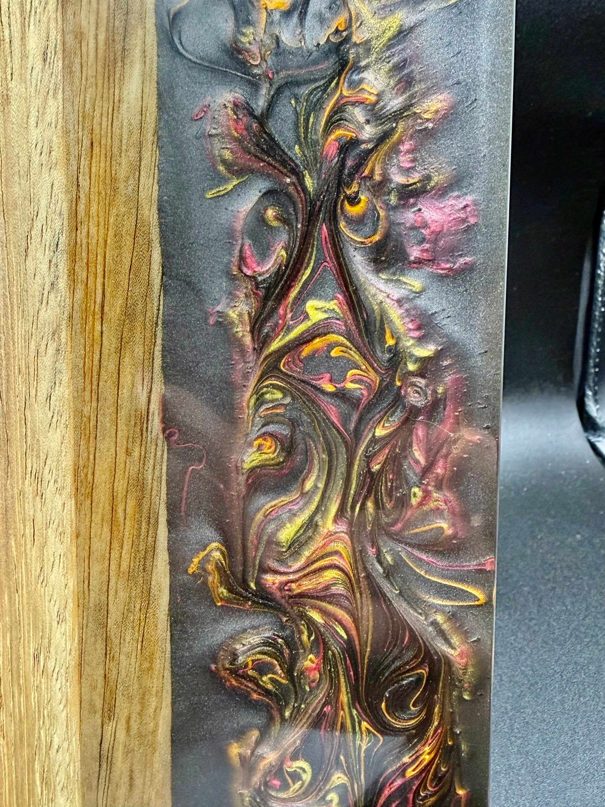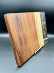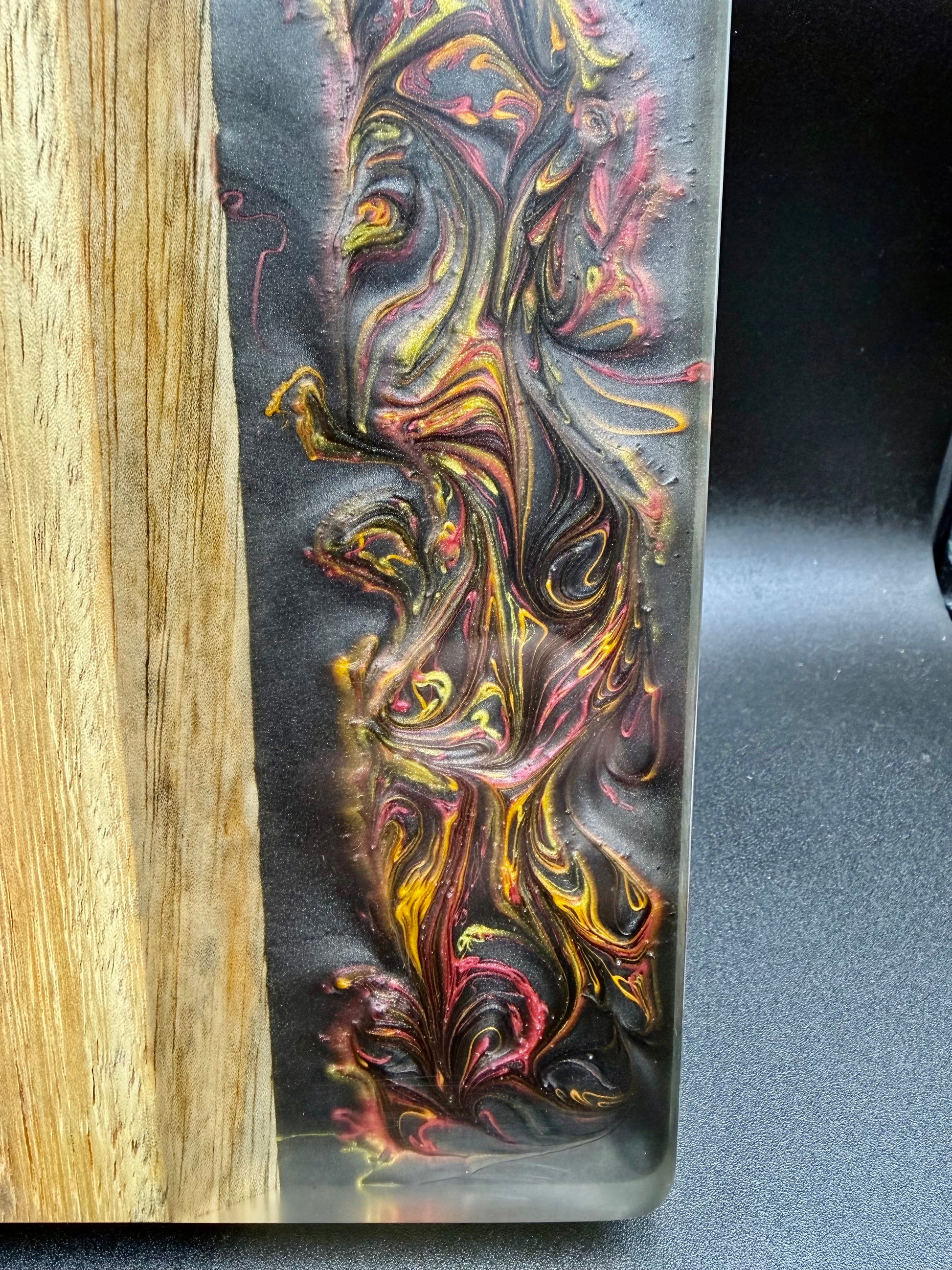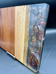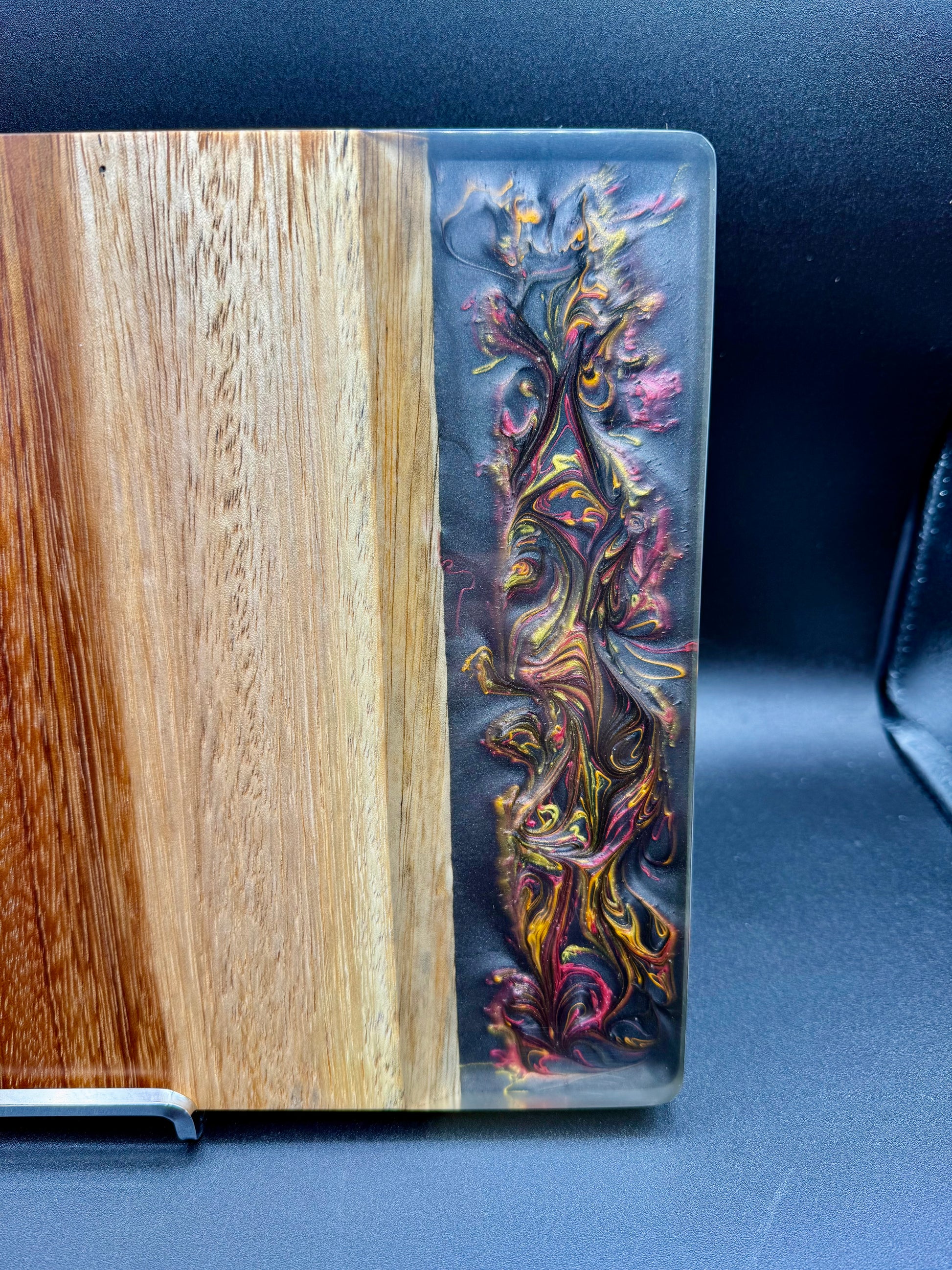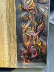 Tagliere artigianale unico, realizzato a mano in legno di iroko con una colata di resina epossidica tridimensionale metallizzata, caratterizzata da un effetto “Supernova” che richiama esplosioni cosmiche, vortici di luce e dettagli cangianti in movimento.